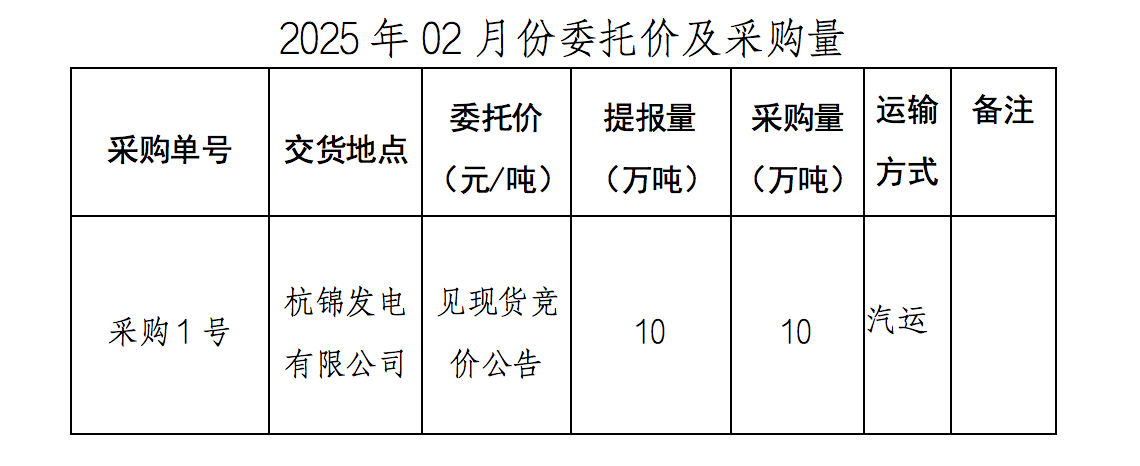 內蒙古能源集團有限公司計劃對所屬杭錦發電有限公司2025年2月市場煤采購進行電子專場交易,交易信息現對外公開發布,凡符合條件的交易商均可參加。